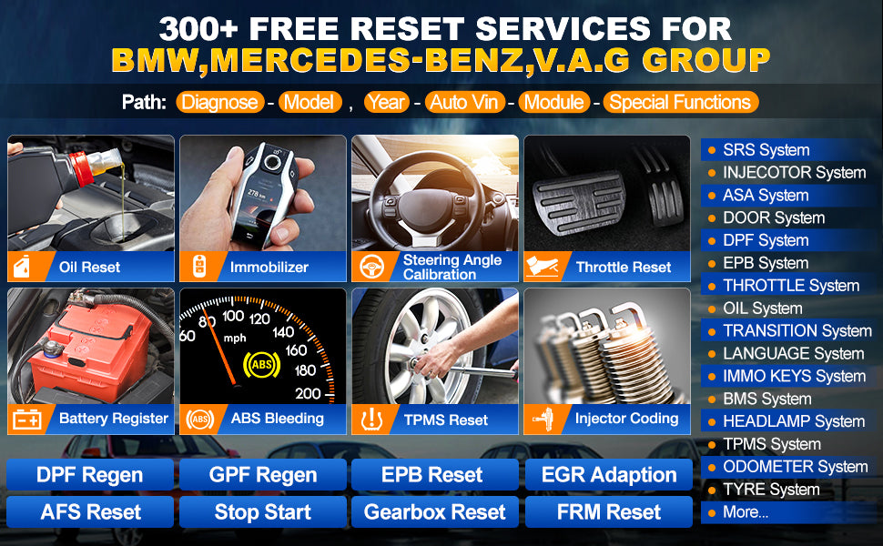 With our specialized maintenance features offered for free for life, you can ensure your vehicle receives the highest level of care and precision at no extra cost. Our comprehensive toolset covers every aspect of vehicle health, from electronic parking brakes to injector reset. Trust in our technology to maintain optimal performance and longevity for your car, giving you peace of mind on every journey, knowing that top-tier maintenance is always within reach.