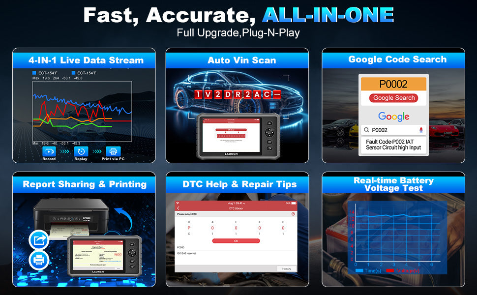 The 919E Lite OBD2 Scanner offers fast and accurate diagnostics with a full suite of features. It includes Report Sharing & Printing for easy communication, DTC Help & Repair Tips for quick troubleshooting, and Real-time Battery Voltage Test along with 4-in-1 Live Data Stream for precise monitoring. The Auto VIN Scan simplifies vehicle identification, and Google Code Search provides instant access to additional information, making it the all-in-one tool for efficient vehicle maintenance.