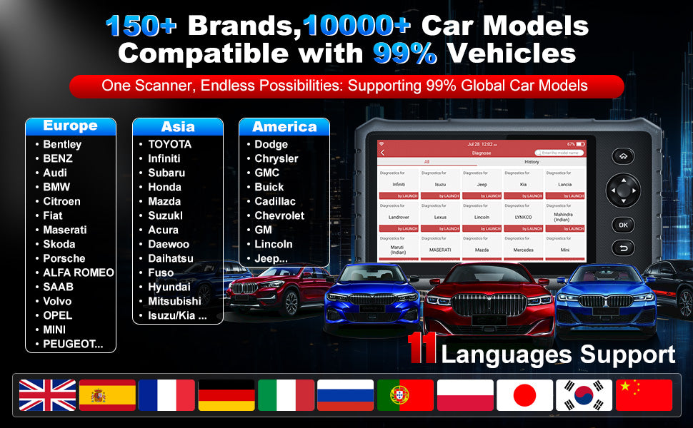 The 919E Lite OBD2 Scanner supports 150+ Brands and 10,000+ Car Models, making it compatible with 99% of vehicles worldwide. This versatile tool provides one scanner, endless possibilities, offering comprehensive diagnostic capabilities for a vast range of global car models. With the 919E Lite, you can handle virtually any vehicle diagnostic task with confidence and precision, ensuring you are always equipped to meet your automotive needs.