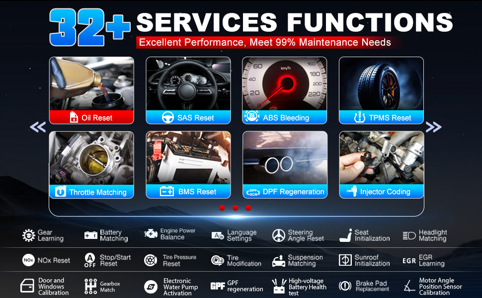 6. 32 Hot Resets: Ideal for workshop maintenance, this scanner supports various resets such as Oil Reset, SAS Reset, ABS Bleeding, TPMS Reset, Throttle Matching, and more.