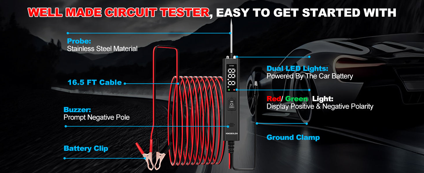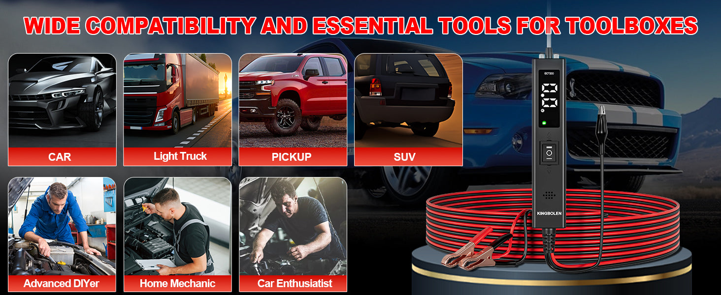 The KINGBOLEN ECT200 is a versatile and reliable circuit tester that works seamlessly across cars, light trucks, pickups, and SUVs, making it the perfect tool for a wide range of vehicles. Whether you're a professional or a DIY enthusiast, its ease of use and consistent performance ensure accurate and efficient circuit testing every time. Choose the KINGBOLEN ECT200 for a smarter, more convenient way to maintain and troubleshoot your vehicle's electrical systems!
