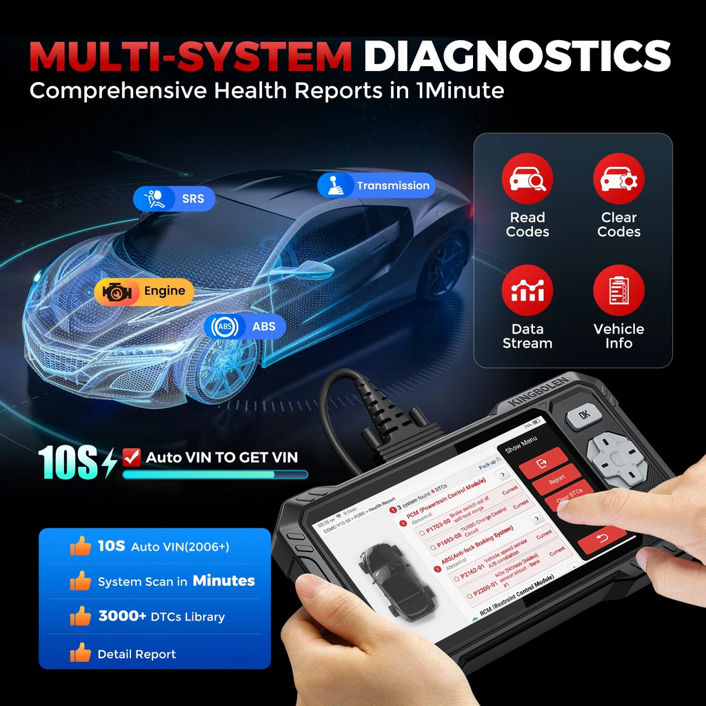 The S608 provides deep, Original Equipment (OE)-level diagnostics for the vehicle's four core systems: Engine, Anti-lock Braking System (ABS), Supplemental Restraint System (SRS - Airbag), and Automatic Transmission (AT). This means it can perform the same comprehensive actions as professional high-end tools: reading and clearing Diagnostic Trouble Codes (DTCs), retrieving system IDs, viewing live data streams, and analyzing freeze frames for a more thorough and precise fault analysis.