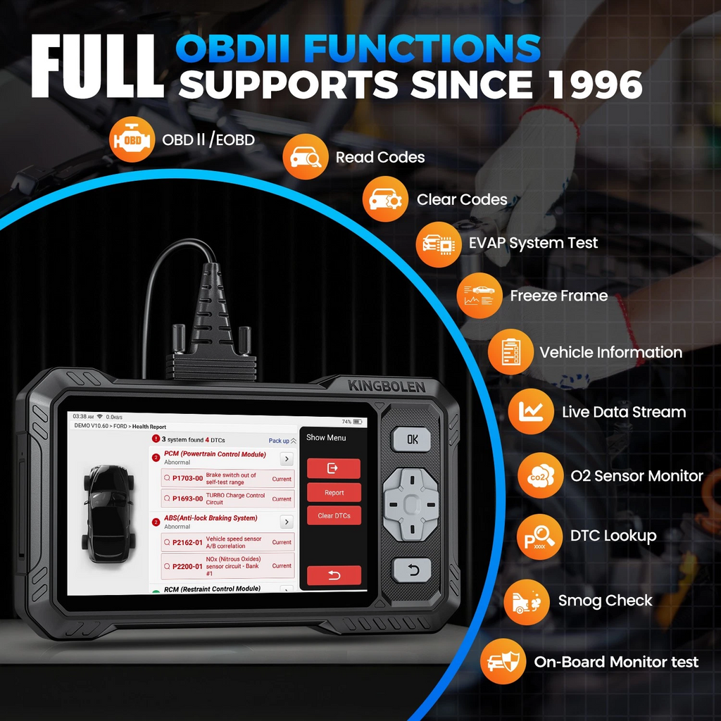 The S608 is an All-in-One diagnostic tool with Full OBD2 Functions (including 10 Test Modes), designed to quickly check the engine and assist with the Smog Test. Key features include: