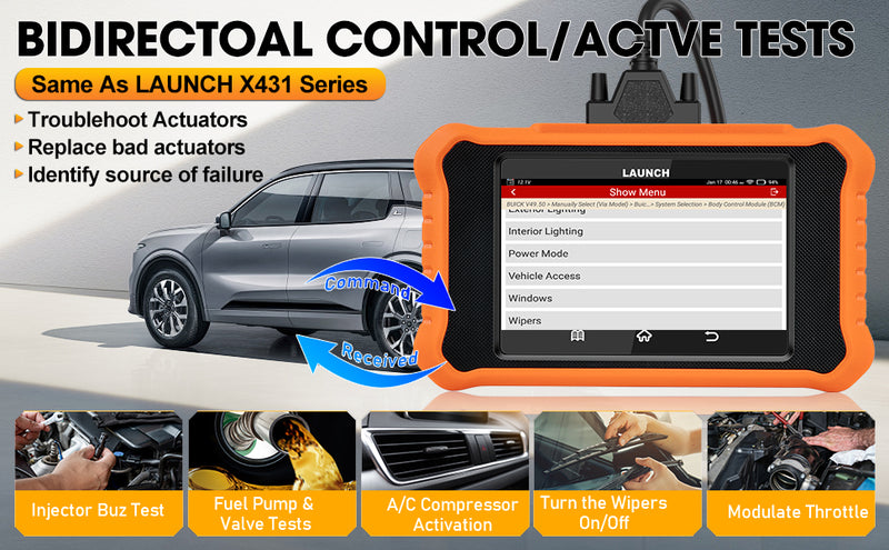 Bi-Directional Control is a feature that allows for two-way communication and control between scanner and car systems. It enables drive solenoids and actuators for active testing, sending commands to the system/component to test its operating status without using the vehicle controls. By utilizing Bi-Directional Control, technicians, mechanicians, car dealer, auto repair shop, DIYer or individual owner can actively monitor and control the behavior of a system, let you quickly understand whether a specific system, component, or subsystem is operating normally. It provides a more comprehensive and interactive approach to testing and troubleshooting, allowing for efficient identification and resolution of issues, pinpoint issues and greatly improve diagnostic efficiency.