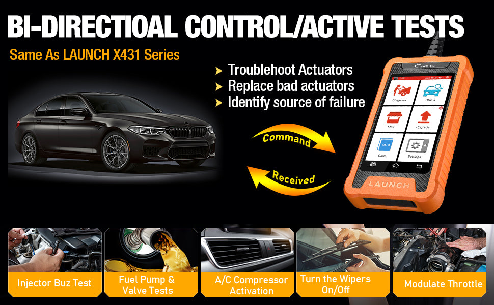 Bi-Directional Control is a feature that allows for two-way communication and control between scanner and car systems. It enables drive solenoids and actuators for active testing, sending commands to the system/component to test its operating status without using the vehicle controls. By utilizing Bi-Directional Control, technicians, mechanicians, car dealer, auto repair shop, DIYer or individual owner can actively monitor and control the behavior of a system, let you quickly understand whether a specific system, component, or subsystem is operating normally. It provides a more comprehensive and interactive approach to testing and troubleshooting, allowing for efficient identification and resolution of issues, pinpoint issues and greatly improve diagnostic efficiency.