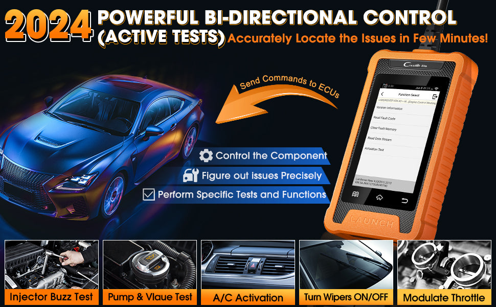 Bi-Directional Control is a feature that allows for two-way communication and control between scanner and car systems. It enables drive solenoids and actuators for active testing, sending commands to the system/component to test its operating status without using the vehicle controls. By utilizing Bi-Directional Control, technicians, mechanicians, car dealer, auto repair shop, DIYer or individual owner can actively monitor and control the behavior of a system, let you quickly understand whether a specific system, component, or subsystem is operating normally. It provides a more comprehensive and interactive approach to testing and troubleshooting, allowing for efficient identification and resolution of issues, pinpoint issues and greatly improve diagnostic efficiency.