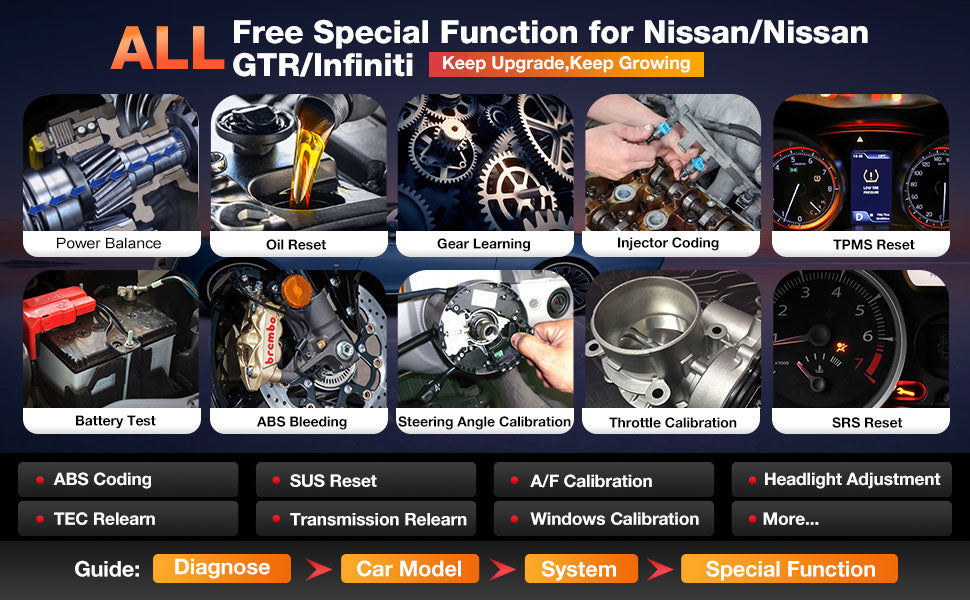 OE-Level Diagnoses with All-Around & In-depth Diagnoses, Make your Work Easier Ever 2024 LAUNCH X431 Elite bidirectional scanner for Nissan, works well on almost all Nissan group vehicles(1994-2023), scans all available modules, providing deeper and more complete diagnostic services. Also, it can perform OE -level diagnostics to read/ clear codes, read ECU info., view Live Data, do active tests, and perform special functions for all available systems.