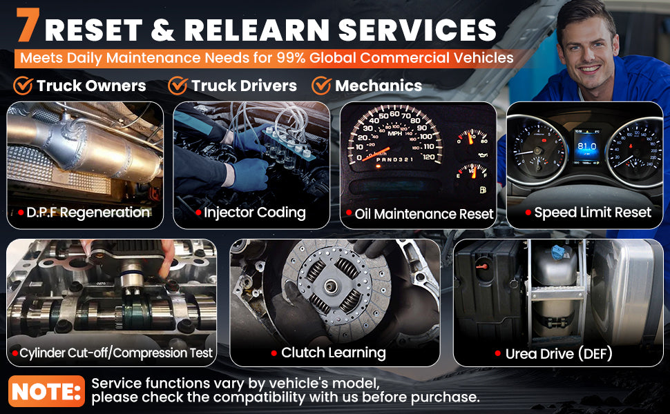 - 7 Reset Services: Perform key maintenance like DPF Regeneration, Oil Lamp Reset, Clutch Learning, Cylinder Cut-off, Compression Test, Speed Limiter Adjustment, and Injector Programming, providing full coverage for your vehicle needs.