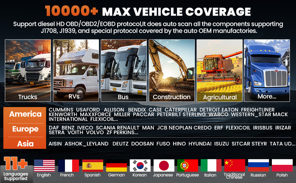 - HD OBD/EOBD/OBD2 Protocols: Handles 10 MODE diagnostics, compatible with 24V trucks and 12V cars. Supports classic protocols like J1939, J1708, J1587 for US HD trucks (Class 3-8).