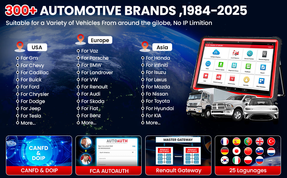 Supports over 20,000 models, 300+ car brands, vehicles from 1986–2024, in 25 languages, with 2 years free updates and no IP restrictions.