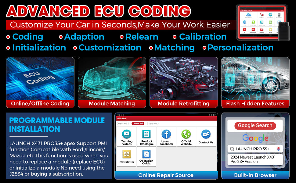 Recode and adapt modules after repairs, deactivate unwanted features like auto start-stop, change chimes, and personalize vehicle settings (supports brands like Nissan, Toyota, Lexus, Hyundai, Benz, Land Rover, Ford, etc.).