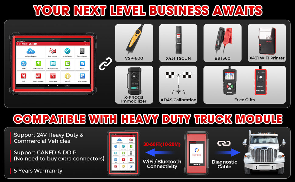 Works with the LAUNCH X431 HDIII module to diagnose light, medium, and heavy-duty trucks, supporting both 12V and 24V systems.