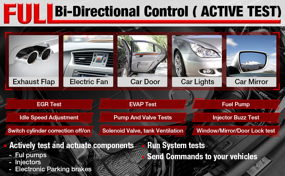 Gain professional-grade access to your vehicle’s internal systems with powerful bi-directional (active test) capabilities. The tool can command components like fuel injectors, radiator fans, window motors, A/C clutches, and more to verify proper operation—helping you quickly identify issues without dismantling parts. Whether you're performing cylinder cut-offs or activating ABS pumps, this function brings dealership-level diagnostics right to your garage.